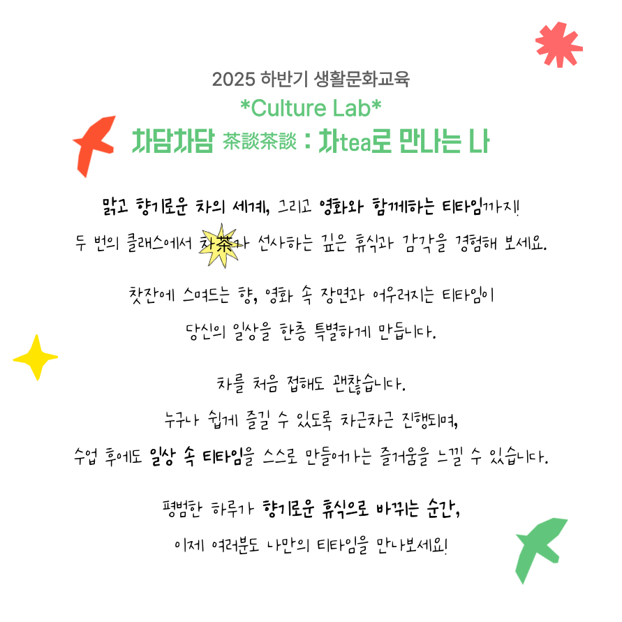 [2025 하반기 생활문화교육] 'Culture Lab_차담차담(茶談茶談) : 차(tea)로 만나는 나' 참여자 모집 안내