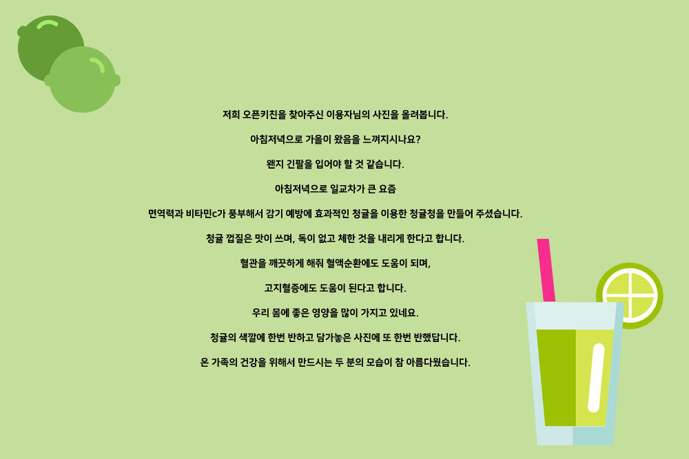 아침 저녁으로 일교차가 큰 요즘 면역력과 비타민c가 풍부해서 감기예방에 효과적인 청귤을 이용한 청귤청을 만들어 주셨습니다.
