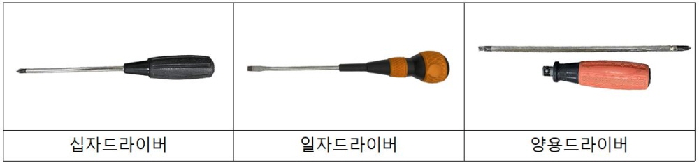 - 양용 드라이버 : 손잡이와 드라이버 부분이 분리가 되며 드라이버 한쪽이 +모양, 다른 쪽이 –모양을 하고 있으며 드라이버 부분을 빼서 필요한 부분으로