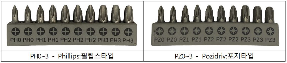 - 십자드라이버 : +모양의 드라이버로 +홈이 있는 피스나 볼드를 조이거나 풀 때 사용되며 규격은 PH0~3(Phillips:필립스타입), PZ0~3(Pozidriv:포지타입)으로