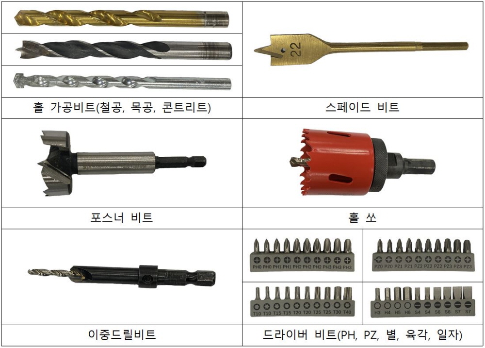 - 드라이버비트 : 많이 사용되는 십자비트, 일자비트 외에 특수비트(별, 육각 등) 등이 있다.